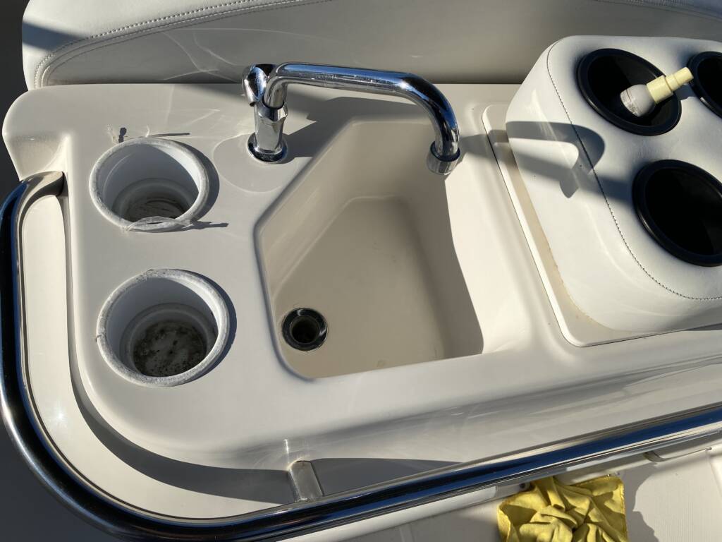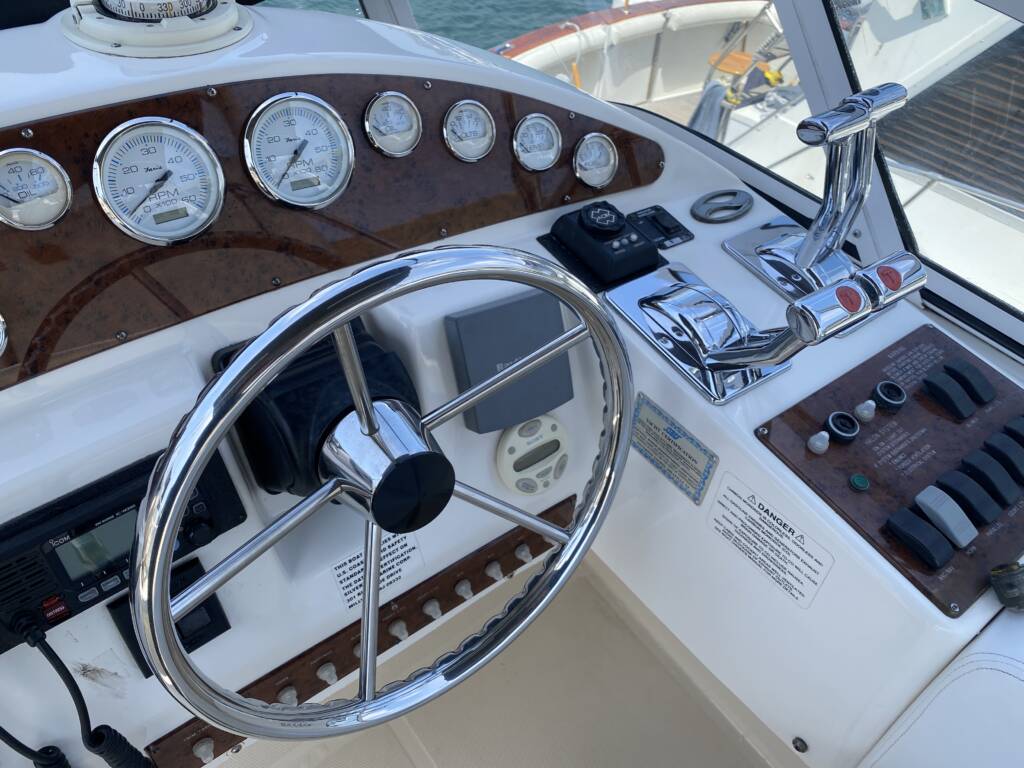 Shifters, in particular, are a detail we never overlook. They should always be spotless, free from oxidation or corrosion, and gleaming like new. Consistent polishing and protection help maintain the yacht’s elegant look while preventing long-term wear and damage. As you can see in the picture below, we take time to make sure the upper helm is clean, shiny, and protected from corrosion and oxidation. This is more than just a wipe down, this is attention to detail.